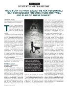 visible. Finally, I spotted a young man in his early- to mid-20s pushing a loaded cart toward the back doors of the produce department. I approached him and asked if hehadaminutetohelpme.ItoldhimI was asked to make a fruit salad and vege- table soup for a friend’s birthday. I told the employee my friend was not excited at the prospect of eating healthy, but it was doctor’s orders. I wanted to prove to him that healthy foods could also taste good.