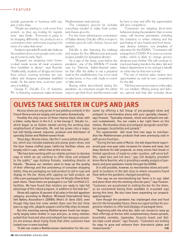 “We have been working with our retailer partners to develop ways in which we can continue to offer olives and antipasti to the public,” says Giuliana Pozzuto, marketing director at DeLallo. “Because our retailers want to keep up the quality of their offerings and the consistency of consumer shopping habits, they are packaging our bulk product to sell in cups and display on the bar. Along with cupping our bulk product, we offer a pre-packaged line that has over 40 DeLallo Olive & Anti- pasti items. These items are packaged in our SQF-certi ed U.S. facilities. We have found that retailers are ready to take full advantage of this robust program, in addition to the bulk bar.”