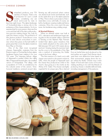 less than eight hours. The alpine landscape of Switzerland plays a strong role in the endurance of the cheese industry. So it’s no surprise that for every person, there are five cows and that half of the dairy milk produc- tion goes into making cheese. Yes, truly it’s quite the cheesy country. The architects of this glorious product? Swiss Brown cows can be seen almost everywhere in sum- mer, where they graze on the lush buffet of green grass that covers the alpine meadows from May to October.